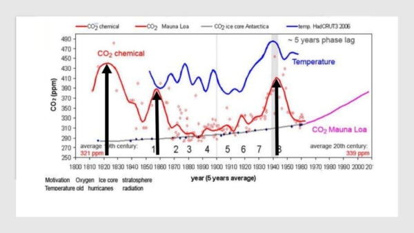 Έστειλαν, μεταξύ της χρονικής περίοδου 1800 και 1960, 93.000 αερόστατα σε τέσσερις ηπείρους που είχαν παγίδες αέρος με σκοπό να προσδιορίσουν την ποσότητα του ατμοσφαιρικού CO2. Τα αποτελέσματα παρουσιάζονται στην εικόνα 1 και είναι πάρα πολύ σημαντικά. Παρατηρούμε συγκεντρώσεις του ατμοσφαιρικού CO2 πολύ μεγαλύτερες από τις σημερινές, χωρίς να γίνεται χρήση των υδρογονανθράκων, παρά μόνο περιορισμένη χρήση λιθάνθρακα.