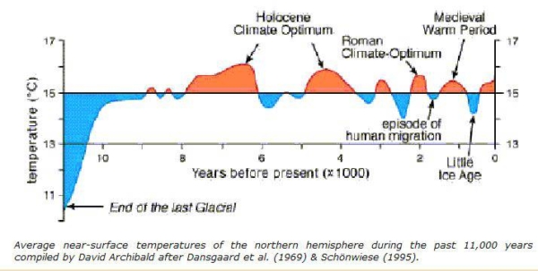 • Δεύτερον, η άνοδος της θερμοκρασίας κατά 0.5 βαθμούς Κελσίου τα τελευταία 40 χρόνια δεν συνιστά υπερθέρμανση του πλανήτη διότι στο παρελθόν, κατά το Ολόκαινο, είχαμε πολύ πιο υψηλές θερμοκρασίες για πάρα πολύ μεγάλα διαστήματα. Ασσύριοι, Βαβυλώνιοι, Αιγύπτιοι, Μινωίτες, Αρχαίοι Έλληνες, Ρωμαίοι και Βυζαντινοί ζήσανε σε πολύ μεγαλύτερες γήινες θερμοκρασίες που είναι ιστορικά καταγεγραμμένες.