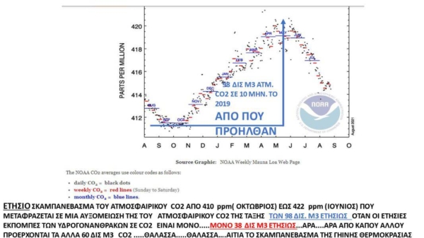 Παρ’ όλα αυτά το ατμοσφαιρικό CO2 αυξήθηκε. Γιατί; Διότι απλούστατα το ατμοσφαιρικό CO2 δεν προέρχεται μόνο από την καύση των υδρογονανθράκων. Και το γράφημα της National Oceanographic and Atmospheric Administration (εικόνα 5) που στηρίζεται σε στοιχεία του σταθμού Mauna Loa, Hawaii, USA για το έτος 2019, το επιβεβαιώνει. Ναι, παρ’ όλο ότι είχαμε μείωση των εκπομπών CO2 από τους υδρογονάνθρακες (ΙΕΑ), το άθροισμα των εκπομπών του ατμοσφαιρικού CO2 που καταγράφηκε ήταν 98 δισ. τόνοι, καίτοι οι εκπομπές από τους υδρογονάνθρακες ήταν λιγότερες, 38 δισ. τόνοι.