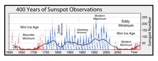 Η θέση που επικρατεί ότι ο άνθρωπος μπορεί να επηρεάσει το γήινο κλίμα είναι φενάκη. Η καθηγήτρια Valentina Zahrkova βασιζόμενη σε παρατηρήσεις που έγιναν επί 420 χρόνια σχετικά με την συμπεριφορά των τεσσάρων ηλεκτρομαγνητικών πεδίων του ηλίου, προβλέπει ότι η γη τα επόμενα 33 χρόνια μπαίνει στην παγετώδη περίοδο Eddy (εικόνα 7) με ό,τι αυτό συνεπάγεται.