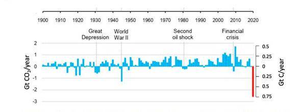 Ένα άλλο σημαντικό γεγονός που συνέβη το 2019 και που διέφυγε της προσοχής των επιστημόνων του ΟΗΕ, ήταν ότι λόγω της πανδημίας του κορονοϊού, οι εκπομπές του CO2 που προήρχοντο από την καύση των υδρογονανθράκων ελαττώθηκαν άνω του 5%. Ήτοι, οι εκπομπές από την χρήση του λιθάνθρακα ελαττώθηκαν κατά 8%, από την χρήση του πετρελαίου κατά 5% και από την χρήση του φυσικού αερίου κατά 2.3% (ΙΕΑ, εικόνα 4),(Koutsoyiannis et al, 2020, Le Quere et. al, 2020).