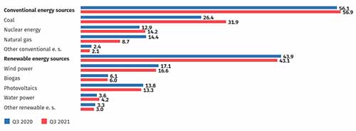 Είναι χαρακτηριστικό ότι, σύμφωνα με τα στοιχεία της γερμανικής στατιστικής υπηρεσίες, το τρίτο τρίμηνο του 2021 αυξήθηκε από 26,4% της συνολικής παραγωγής σε 31,9%. Παράλληλα, μειώθηκε από 14,4% σε 8,7% η συμμετοχή του φυσικού αερίου.