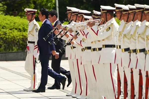 Σε μια ιστορική αλλαγή το 2014, η κυβέρνησή του ερμήνευσε εκ νέου το μεταπολεμικό, ειρηνιστικό σύνταγμα ώστε να επιτρέψει στα στρατεύματα να πολεμήσουν στο εξωτερικό για πρώτη φορά μετά τον Δεύτερο Παγκόσμιο Πόλεμο.