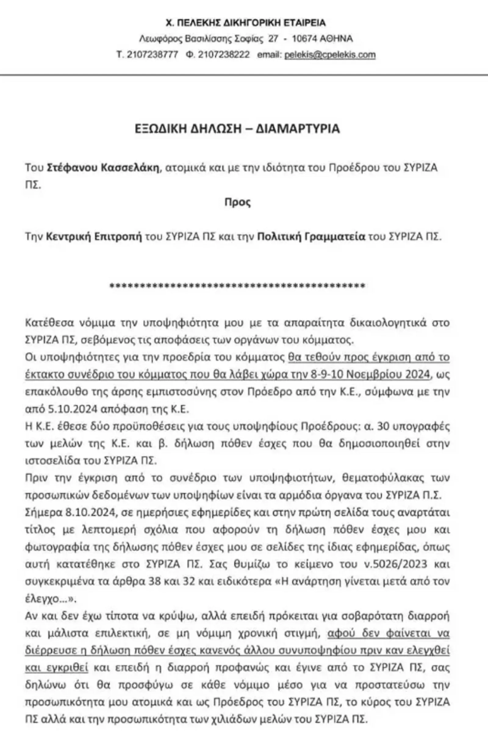 Ο Στέφανος Κασσελάκης αναγκάζεται πλέον να εξετάσει σοβαρά το ενδεχόμενο προσφυγής στη δικαιοσύνη για την προάσπιση των δικαιωμάτων του.».
