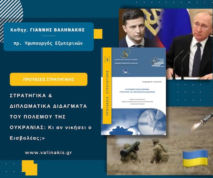 Ισχύς του δικαίου ή δίκαιο του ισχυρού; Ιδού το κεντρικό διακύβευμα του πολέμου στην Ουκρανία για την Ευρώπη αλλά και για τη χώρα μας. Στο παρόν Strategy Paper επιχειρούμε, με τη συμπλήρωση άνω των τριών εβδομάδων από τη ρωσική εισβολή, μια εστίαση στις κρισιμότερες παραμέτρους και τα διδάγματα του πολέμου. Καταβάλλεται προσπάθεια να αναλυθούν τα στρατηγικά διακυβεύματα για την Ευρώπη και την Ελλάδα και παράλληλα να προβλεφθούν οι πιθανότερες εξελίξεις και η διπλωματική εκτόνωση ή και επίλυση του ζητήματος. Η ακριβής πρόβλεψη διανοίγει πάντα περισσότερες δυνατότητες να προληφθούν δυσάρεστα επακόλουθα (ενδεικτικά αναδημοσιεύεται σε παράρτημα αυτούσια η πρόβλεψη που είχαμε επιχειρήσει ένα μήνα πριν την εισβολή σε άρθρο που δημοσιεύθηκε στην Καθημερινή και η οποία δυστυχώς επαληθεύθηκε). Δυστυχώς, με βάση μια ρεαλιστική εκτίμηση των στρατηγικών, διπλωματικών και οικονομικών δεδομένων και την προβολή τους στο ορατό μέλλον, ο πόλεμος δεν φαίνεται να καταλήξει σε ένα δίκαιο αποτέλεσμα (με την έννοια του βασισμένου στο διεθνές δίκαιο). Πιθανότερος είναι αντίθετα ένας πολιτικοστρατηγικός συμβιβασμός, που όχι μόνο δεν θα τιμωρεί τον εισβολέα, αλλά και θα του αναγνωρίζει τελικά και κέρδη σε σχέση με την προ του πολέμου κατάσταση. Κατά συνέπεια, για την Ελλάδα οι εξελίξεις ενδέχεται να είναι ιδιαίτερα αρνητικές και απαιτείται ιδιαίτερη προσοχή, προληπτικές κινήσεις και στρατηγική ευελιξία. Οι επιπτώσεις από τον πόλεμο θα είναι ευρείες και πολυδιάστατες και γι αυτό η κυβερνητική αντιμετώπιση δεν μπορεί να περιορίζεται στις ενεργειακές/οικονομικές πτυχές —παρά την εύλογη σημασία τους για την καθημερινότητα όλων των πολιτών.