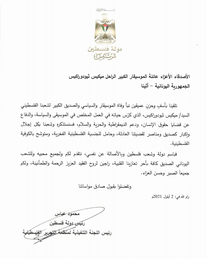 Στο όνομα του κράτους και του λαού της Παλαιστίνης και εκ μέρους μου, εκφράζουμε σε εσάς, τους οικείους του και σε όλο τον φίλο ελληνικό λαό τα θερμά μας συλλυπητήρια. Ευχόμαστε να αναπαυθεί εν ειρήνη η ψυχή του και σε όλους σας