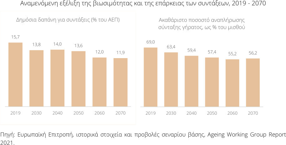 Στο συνταξιοδοτικό σύστημα, η επιδείνωση στο δημογραφικό δείκτη εξάρτησης ηλικιωμένων του ελληνικού πληθυσμού εγείρει ερωτήματα σε σχέση με την επιδίωξη των αρχών της βιωσιμότητας και επάρκειας των συντάξεων. Αφενός, η δημόσια δαπάνη για συντάξεις θα εξακολουθεί να απορροφά σημαντικούς οικονομικούς πόρους, σε διψήφιο ποσοστό του ΑΕΠ έως και το 2070. Αφετέρου, το ακαθάριστο ποσοστό αναπλήρωσης για τη σύνταξη γήρατος αναμένεται να μειωθεί περαιτέρω, έως και περί το 55% το 2060.