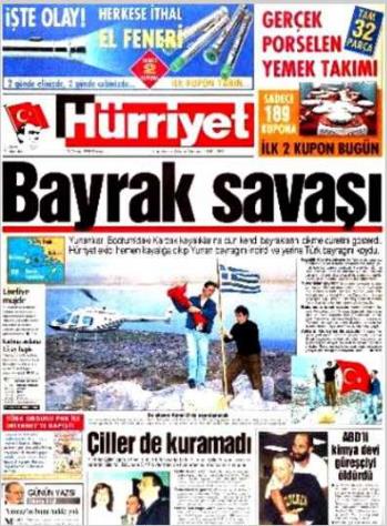 27 Ιανουαρίου 1996: Δύο δημοσιογράφοι της εφημερίδας «Χουριέτ» στη Σμύρνη μεταβαίνουν με ελικόπτερο στη Μεγάλη Ίμια. Υποστέλλουν την ελληνική σημαία και υψώνουν την τουρκική. Η όλη επιχείρηση βιντεοσκοπείται και προβάλλεται από το τηλεοπτικό κανάλι της «Χουριέτ».