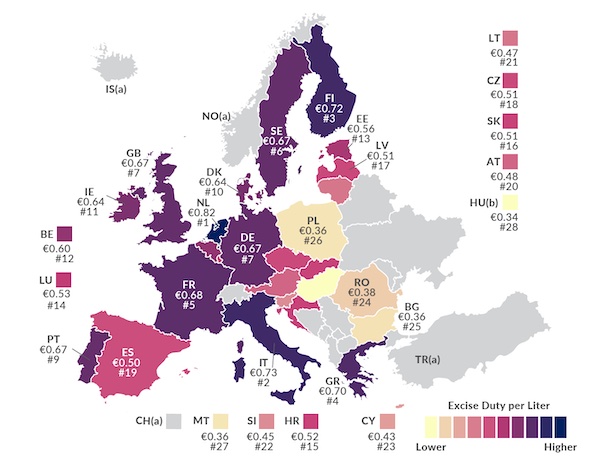 Η Ολλανδία έχει τον υψηλότερο φόρο στην Ευρωπαϊκή Ένωση, με 0.82 € ανά λίτρο. Η Ιταλία εφαρμόζει τη δεύτερη υψηλότερη τιμή στα 0.73 € ανά λίτρο), ακολουθούμενη από τη Φινλανδία με 0.72 € ανά λίτρο και την Ελλάδα (0,70 ευρώ ανά λίτρο).