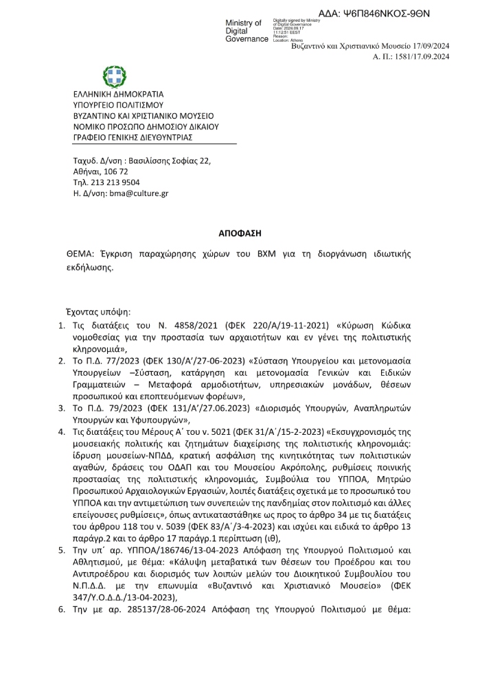 Μάλιστα, το σχετικό έγγραφο, με ημερομηνία έκδοσης 17/9/2024 και τίτλο «Έγκριση παραχώρησης χώρων του ΒΧΜ για τη διοργάνωση ιδιωτικής εκδήλωσης», φανερώνει και την ταχύτητα με τον οποία υλοποιήθηκε το σχετικό αίτημα, που υπεβλήθη μόλις ένδεκα ημέρες νωρίτερα, στις 6 Σεπτεμβρίου. Το θέμα εισήχθη στο ΔΣ του ΒΧΜ και εγκρίθηκε στην συνεδρίασή του της 12ης Σεπτεμβρίου.