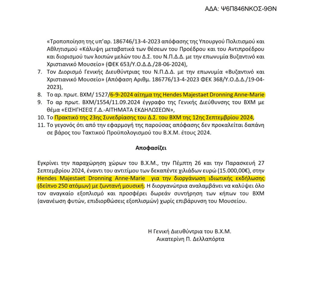 Με μια προκλητική απόφαση της διορισμένης από την υπουργό Λίνα Μενδώνη γενικής διευθύντριας του Βυζαντινού και Χριστιανικού Μουσείου (ΒΧΜ), Αικατερίνης Δελλαπόρτα, το εμβληματικό μουσείο παραχωρείται στην οικογένεια Γλύξμπουργκ για να πραγματοποιήσει ένα γαμήλιο ιδιωτικό δείπνο!