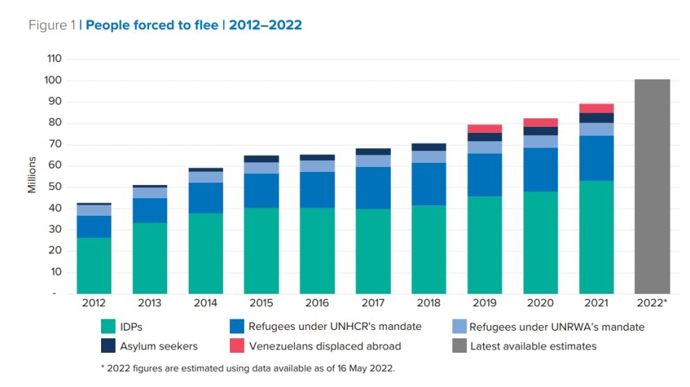 Μέχρι τον Μάιο του 2022, περισσότεροι από 100 εκατομμύρια άνθρωποι στον κόσμο αναγκάστηκαν να εκτοπιστούν εξαιτίας διώξεων, συγκρούσεων, βίας, παραβιάσεων ανθρωπίνων δικαιωμάτων ή γεγονότων που διαταράσσουν σοβαρά τη δημόσια τάξη.