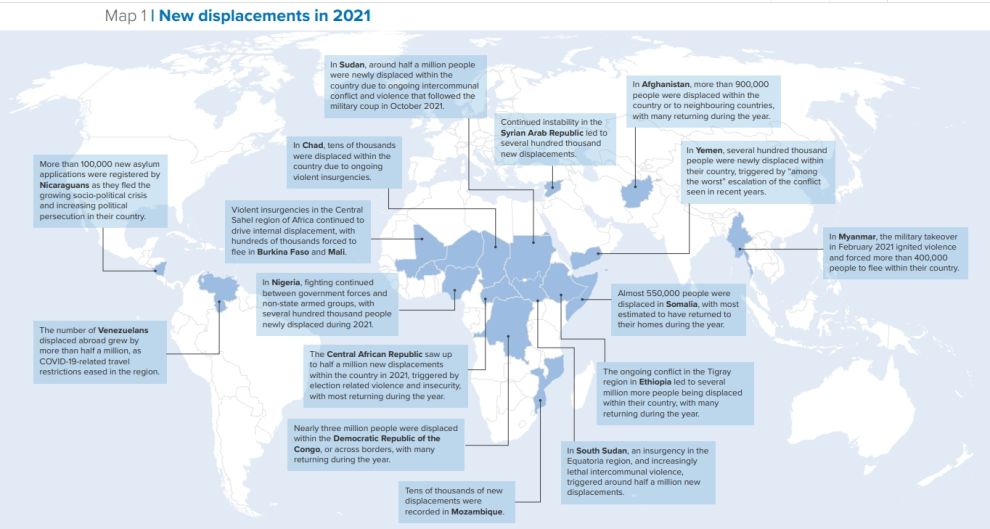 Την περασμένη χρονιά αυξήθηκε επίσης για 15 συνεχή χρονιά ο αριθμός των ανθρώπων που εκτοπίστηκαν στο εσωτερικό της χώρας τους εξαιτίας των συγκρούσεων, φτάνοντας τα 53,2 εκατομμύρια. Η αύξηση αυτή προκλήθηκε λόγω της επιδεινούμενης βίας ή των συρράξεων σε ορισμένες περιοχές, όπως για παράδειγμα στη Μυανμάρ. Η σύρραξη στο Τιγκρέ της Αιθιοπίας και σε άλλες περιοχές προκάλεσε τη φυγή εκατομμυρίων ανθρώπων μέσα στη χώρα. Οι εξεγέρσεις στην περιοχή του Σαχέλ οδήγησαν σε νέο εσωτερικό εκτοπισμό, ιδίως στη Μπουρκίνα Φάσο και το Τσαντ.